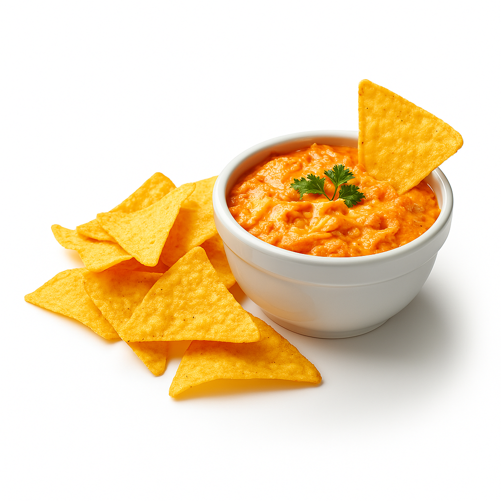 Shredded Buffalo chicken cheese dip served in a warm skillet with corn tostada chips