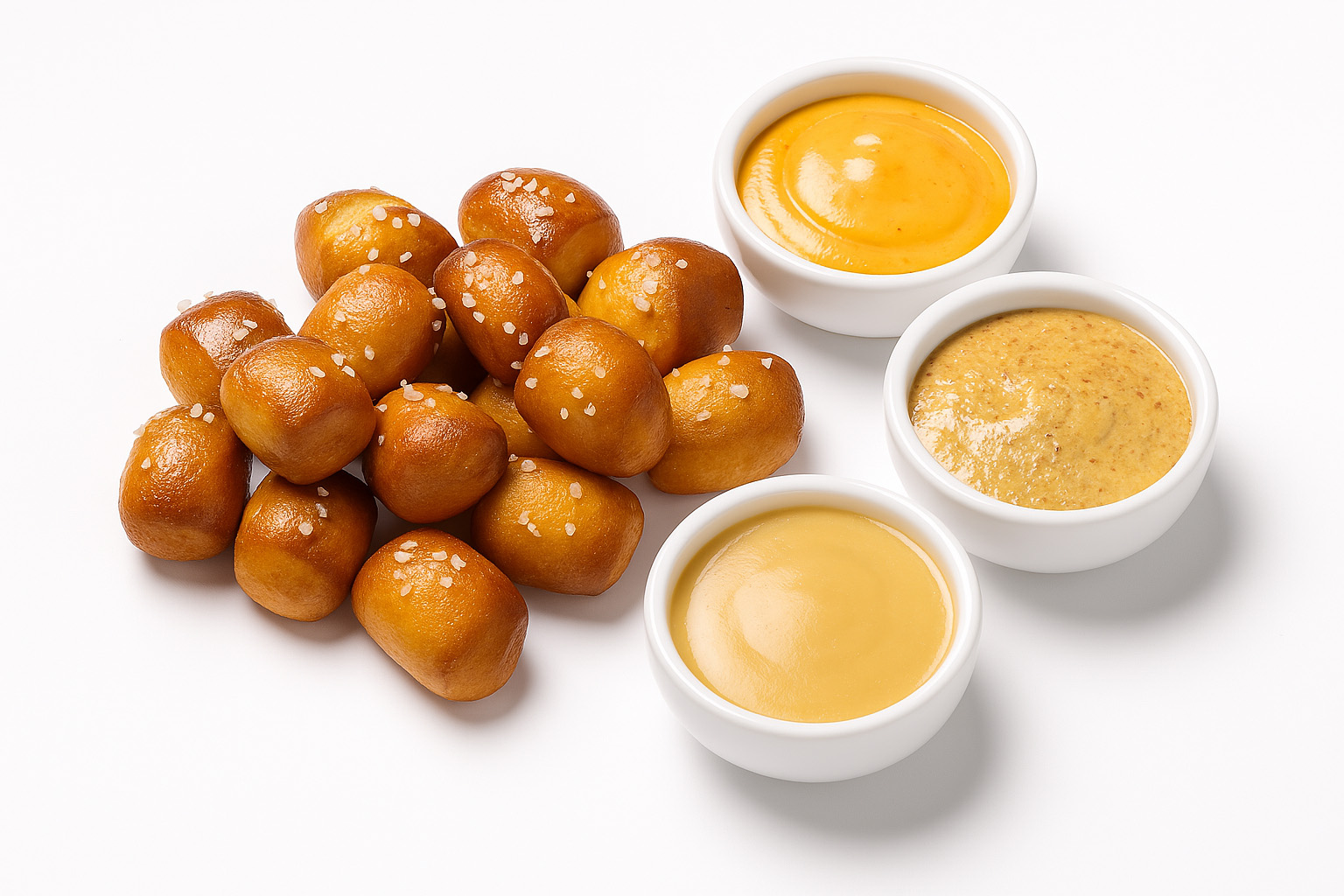 Pretzel bites served with beer cheese, spicy mustard, [[&}] honey mustard